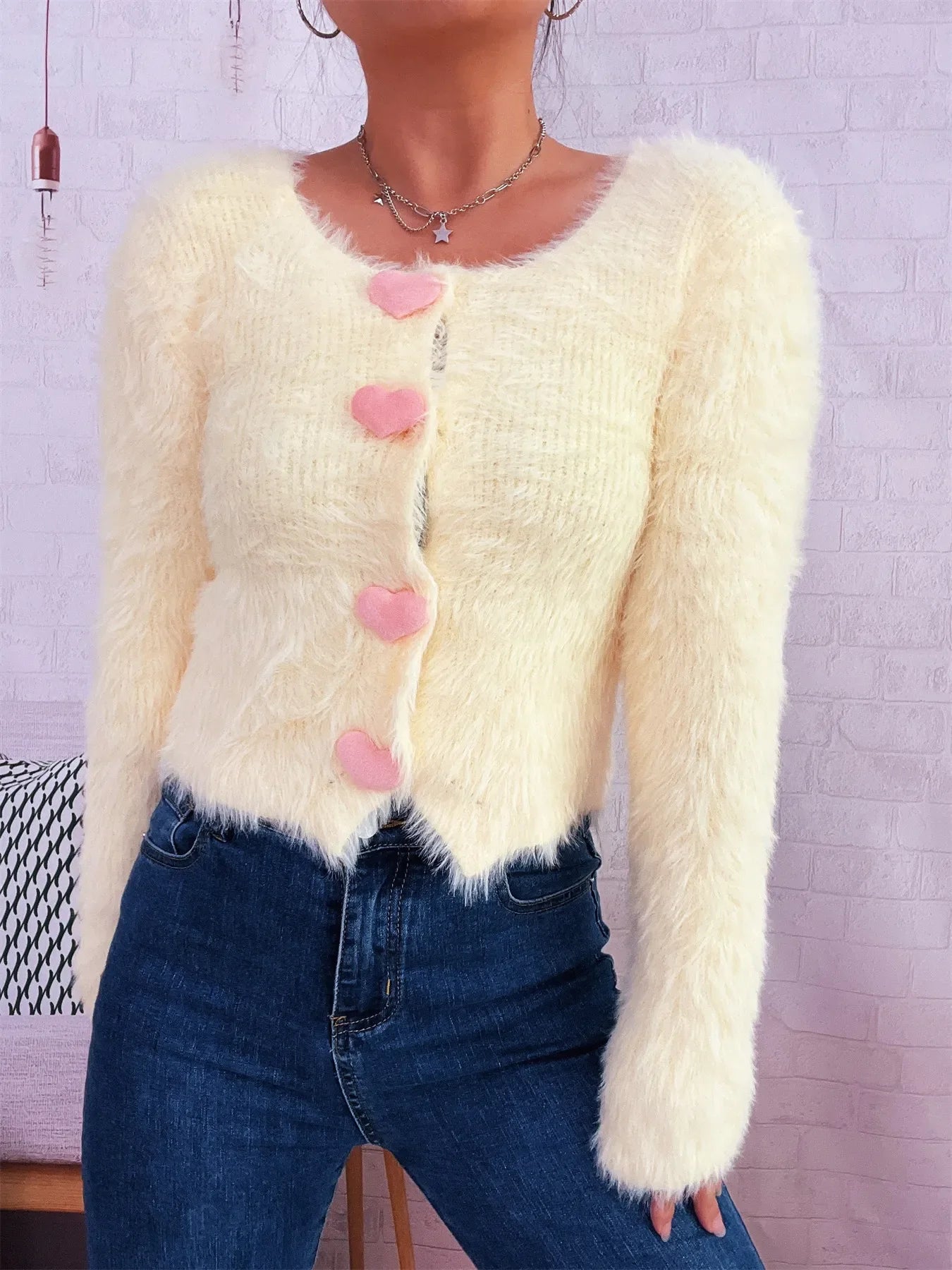 This plush cardigan features a soft, fuzzy knit with a slightly stretchy feel for comfortable wear. The front is secured by a buttoned placket with four pink heart-shaped buttons, adding a playful touch while maintaining a refined silhouette. The garment is crafted from 100% polyester and designed to provide warmth without bulk, making it suitable for layering over tops and dresses.