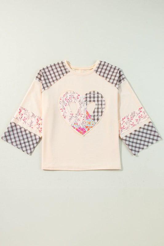 Beige Plaid Floral Peace Heart Graphic Wide Long Sleeve Top