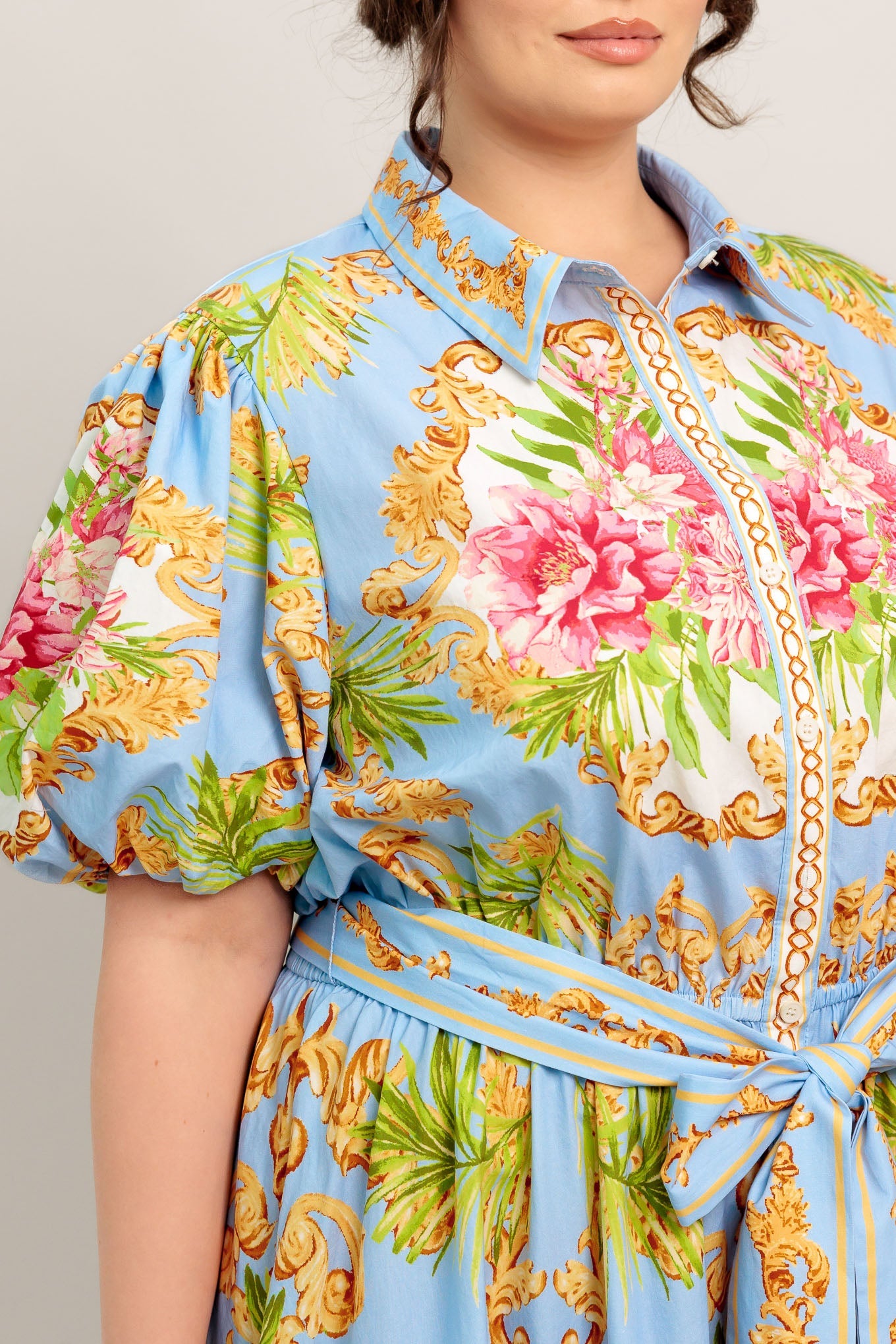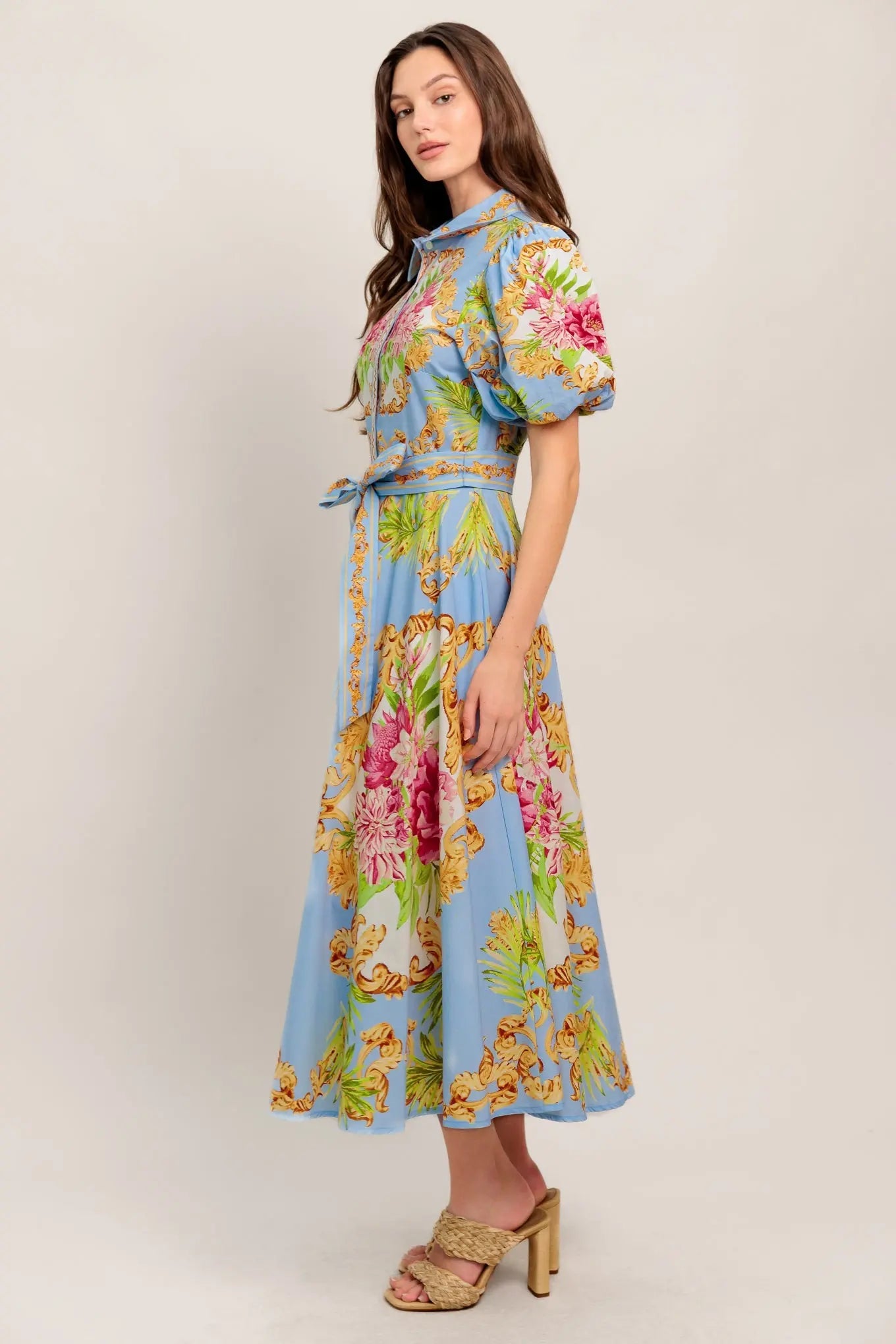 Blue Palace Printed Woven Midi Dress With Collar Button Down Self Sash Tie Flying Tomato