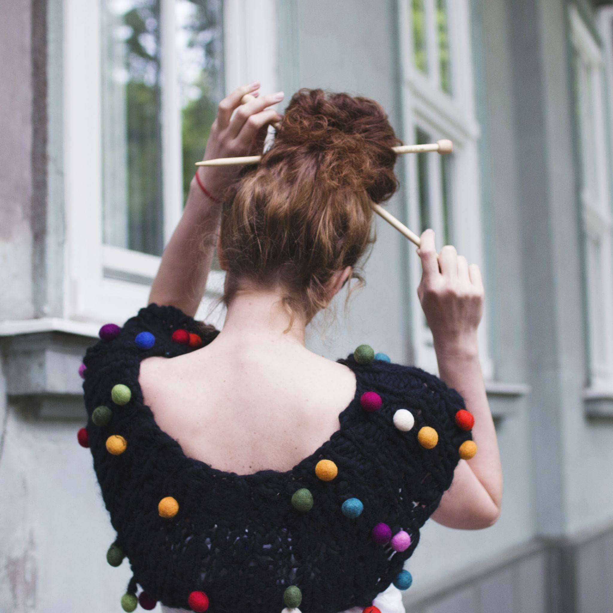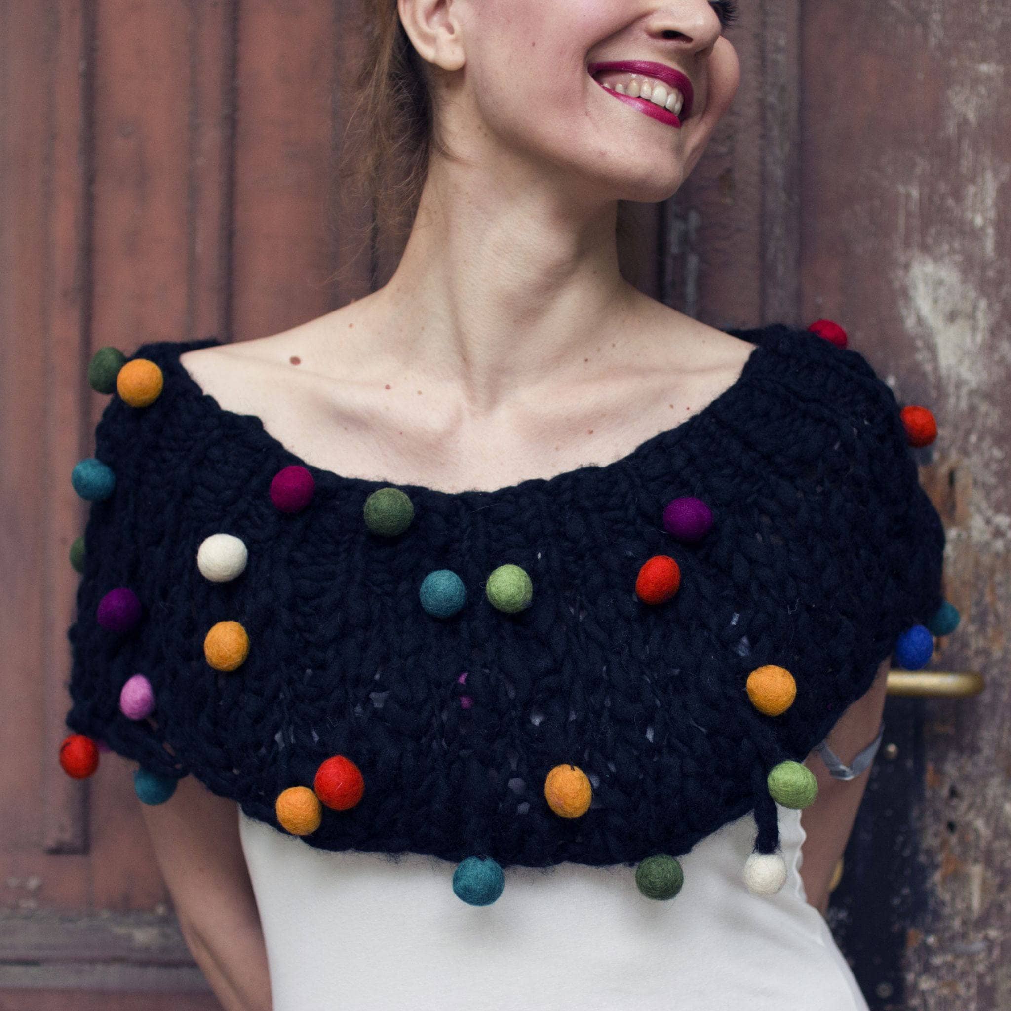 Wear this fun poncho over the shoulders as a shawl or poncho, or around your neck as a cowl! Our Thick and Thin Felt Ball Yarn makes this a quick knit, and the simplicity of the pattern is elevated by the handmade pom poms sprinkled in each skein of yarn.