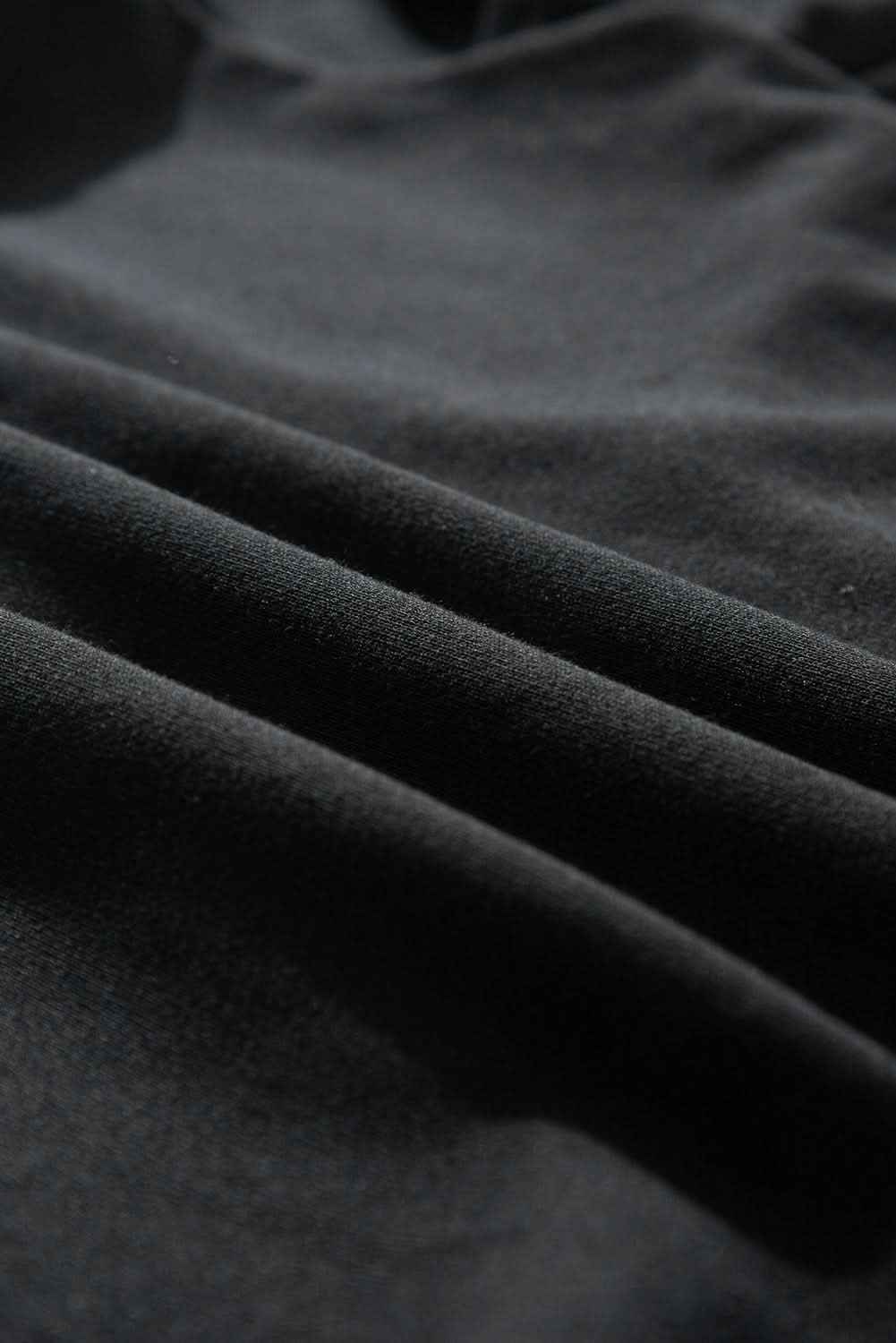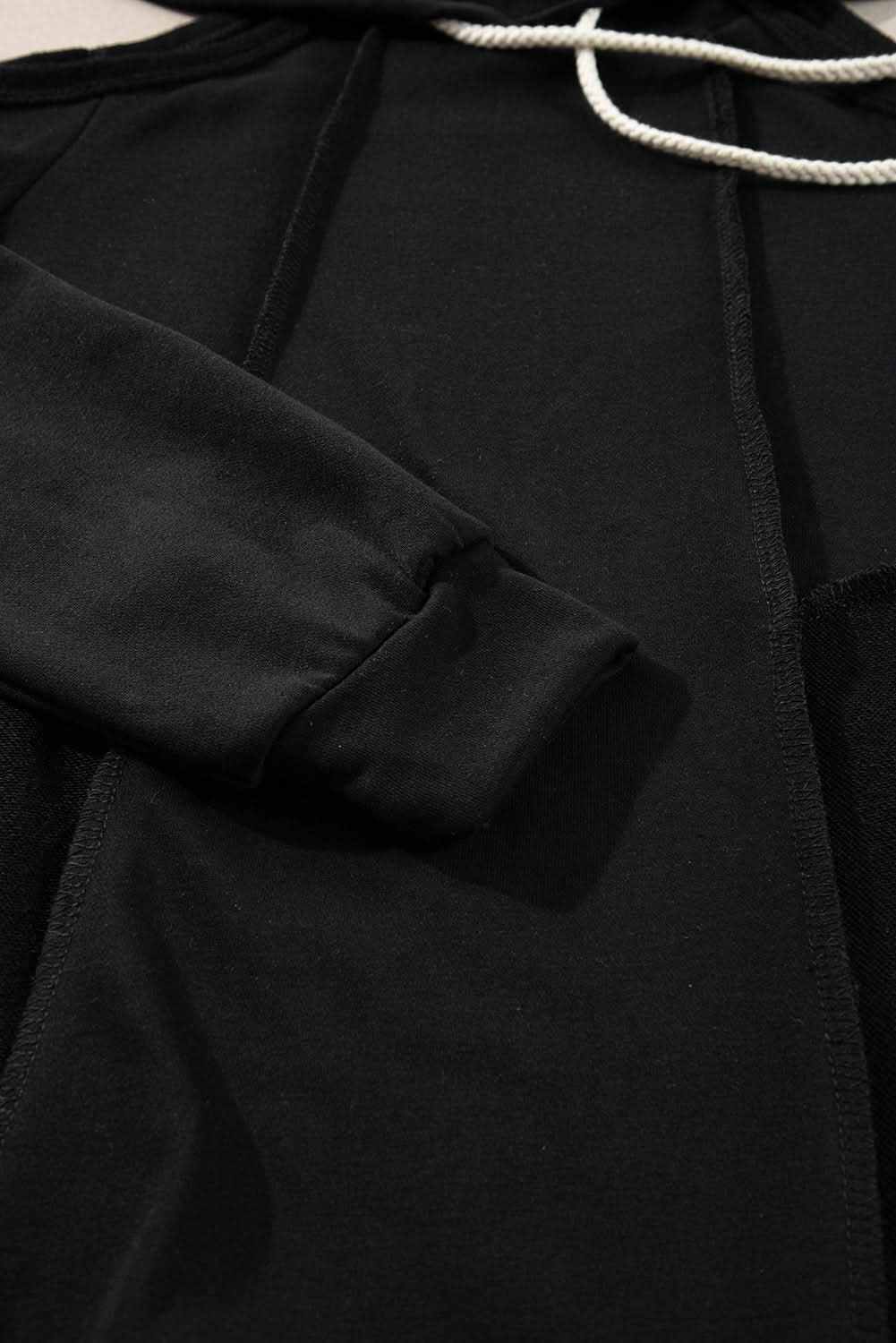 The garment includes an adjustable drawstring hood and subtle exposed seam detailing that add texture without overwhelming the clean, solid black finish. Its straightforward color makes it easy to pair with denim or lounge wear.