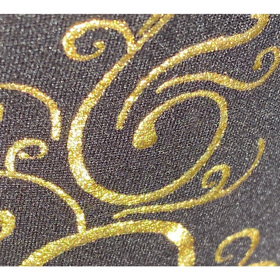 These leggings have a stylized tree and ornament pattern. They are made by screen printing actual glitter on the fabric to create a gold glitter look. Perfect bling for the holidays. The material is super soft made of 92% polyester 8% Spandex.