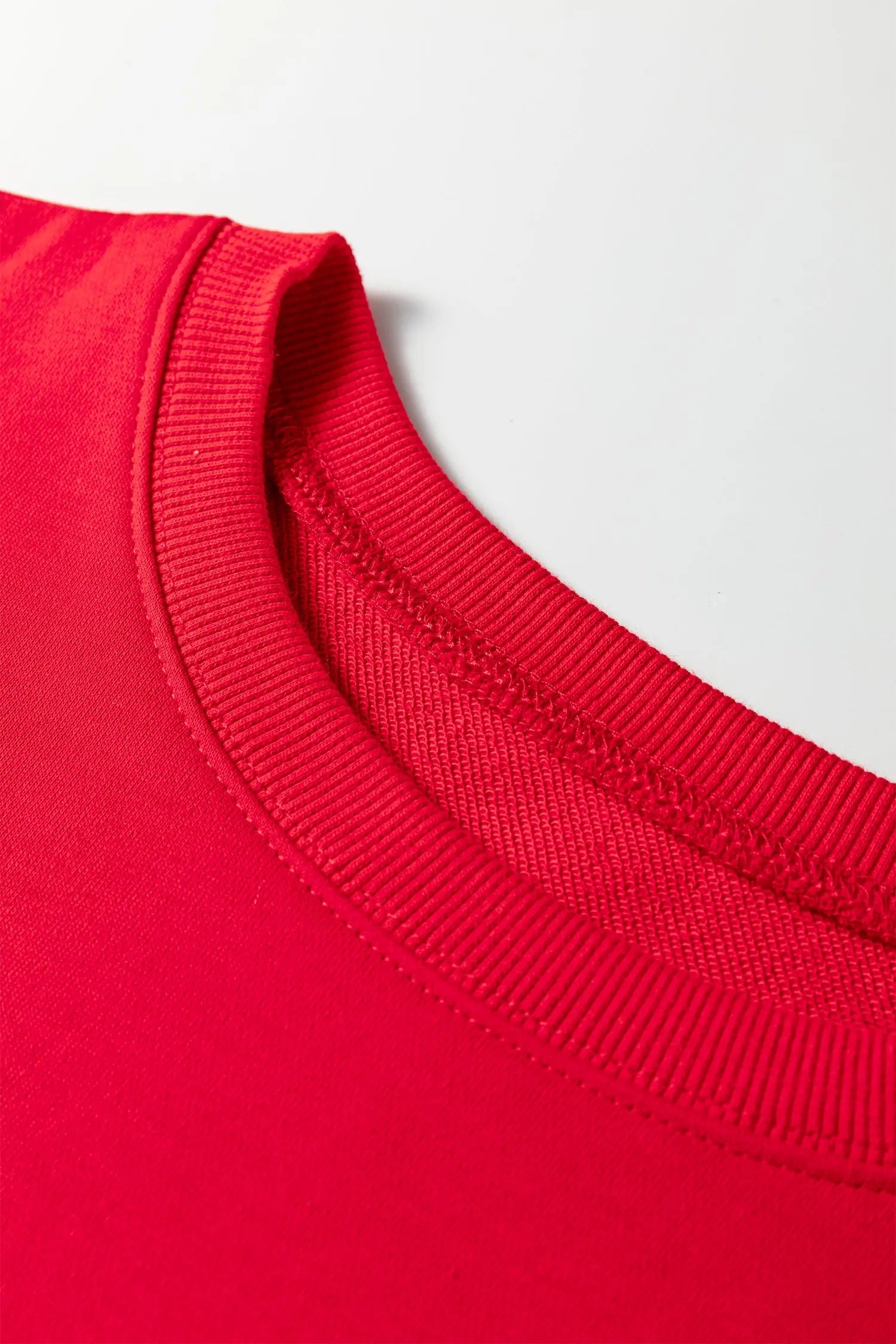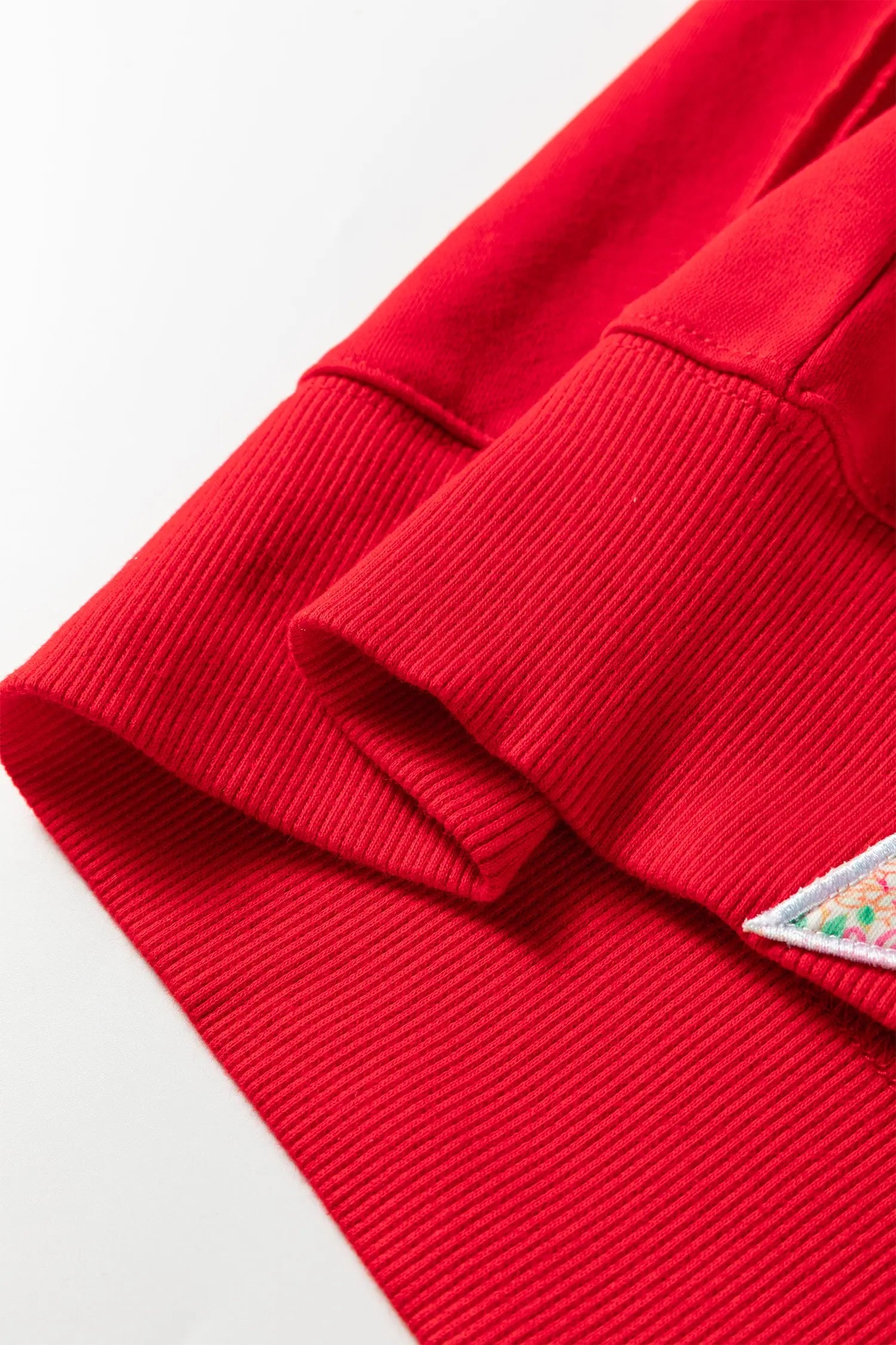Fiery Red Floral Bow Patchwork Exposed Seam Slit Baggy Sweatshirt