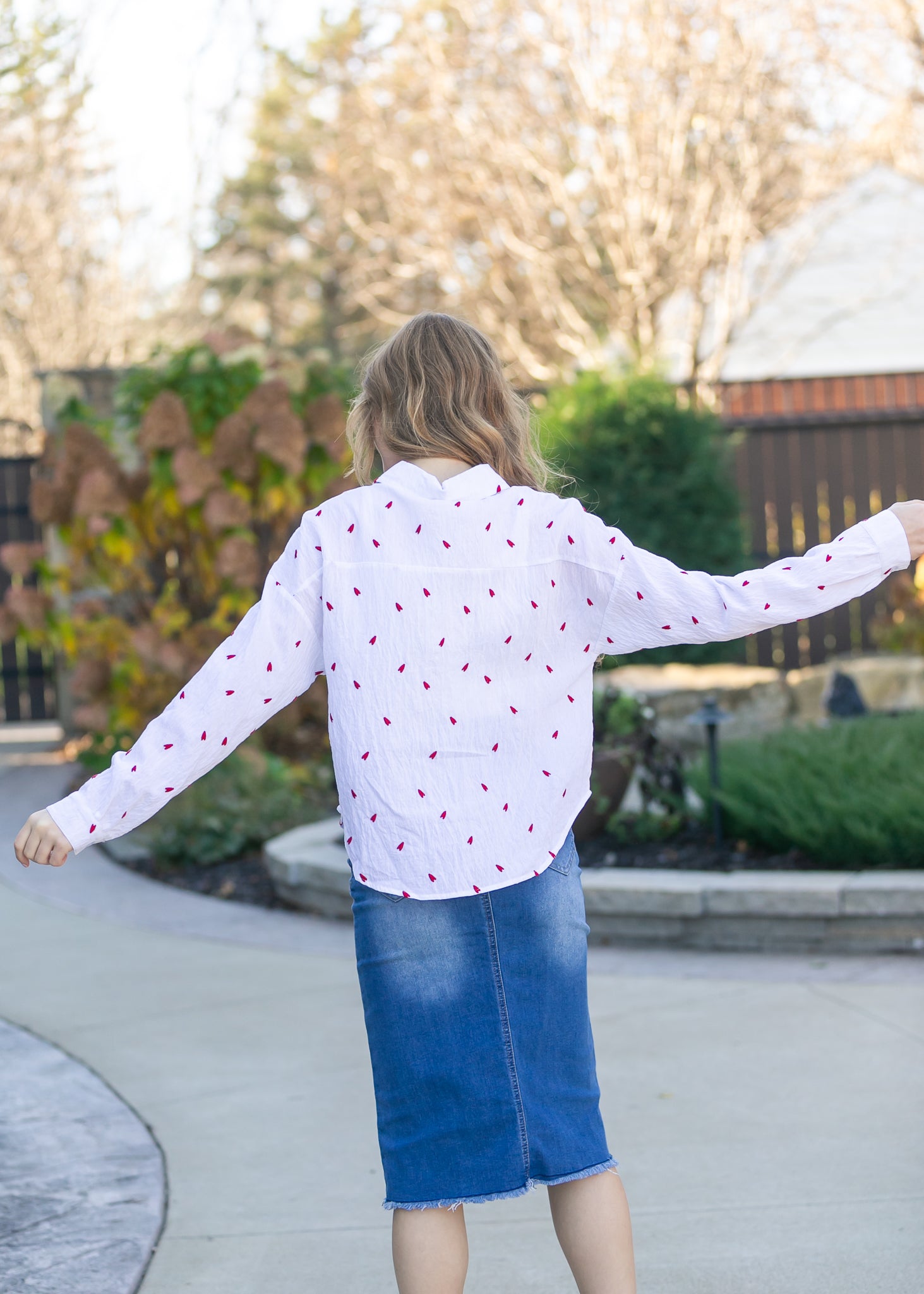 The Hadley High Rise Denim Midi Skirt is an Inherit Design made from a quality fabric that will last for seasons to come! Designed with a stretch high-rise waist, a modest midi 26" length, and backed distressing. It features a minimalist modern look, a classic leather patch, and a beautiful crisp medium wash. There is a hidden inside pocket message - "altogether beautiful in every way". Pair it with your favorite Inherit Designed top or T-Shirt all season long!