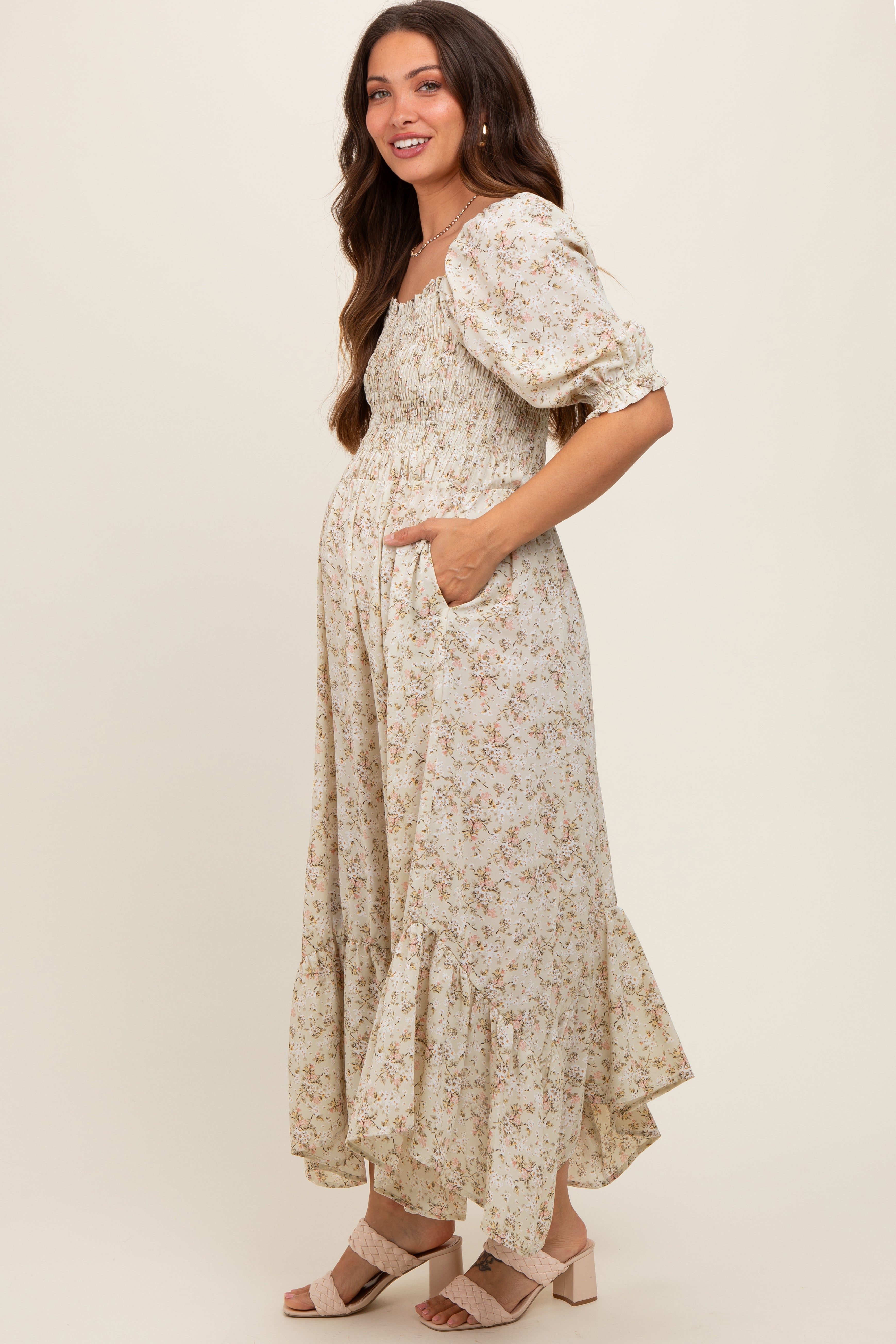 Effortlessly chic and designed for every stage of pregnancy, this smocked handkerchief hem maternity dress is your new must-have. The flattering smocked bodice provides gentle stretch and support, while the stylish handkerchief hem adds playful movement to your look. Soft, lightweight fabric keeps you comfortable from bump to baby and beyond. Dress it up with your favorite accessories for a special occasion or pair with sandals for all-day ease. Nursing-friendly and beautifully flowy, this dress helps you celebrate your changing shape in style.