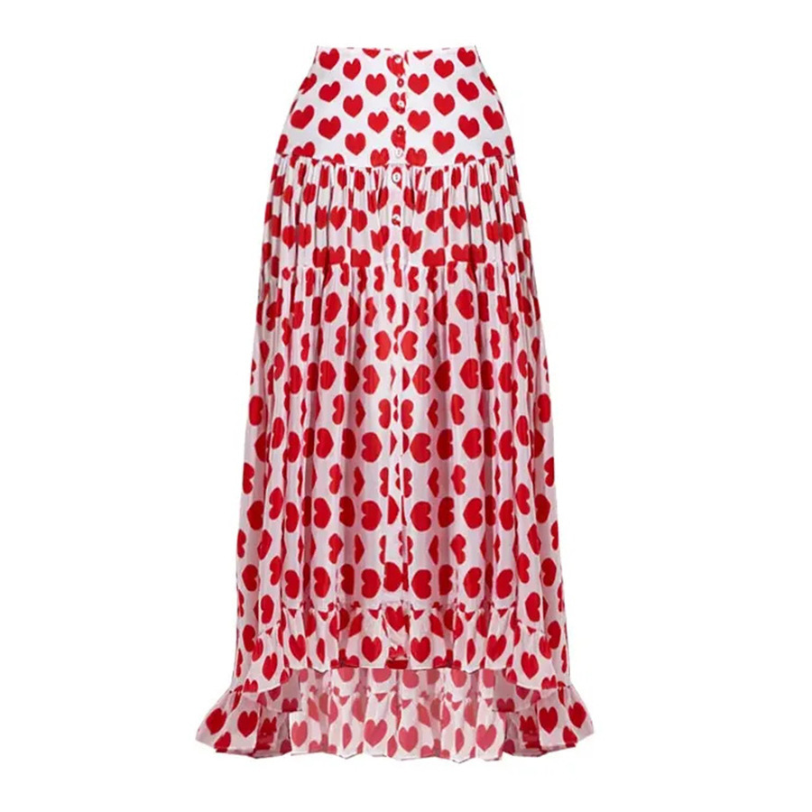 This one-piece swimsuit features a strapless, sweetheart neckline with a center tie, complemented by a chiffon-style overlay that creates a flowing, maxi-dress silhouette. Crafted from polyester, the garment offers lightweight comfort for summer wear. The bold red heart pattern on a white background provides a playful yet chic look suitable for beach days, poolside lounging, or resort vacations. The sleeveless bodice pairs with a high-low chiffon skirt for ease of movement and a feminine silhouette.