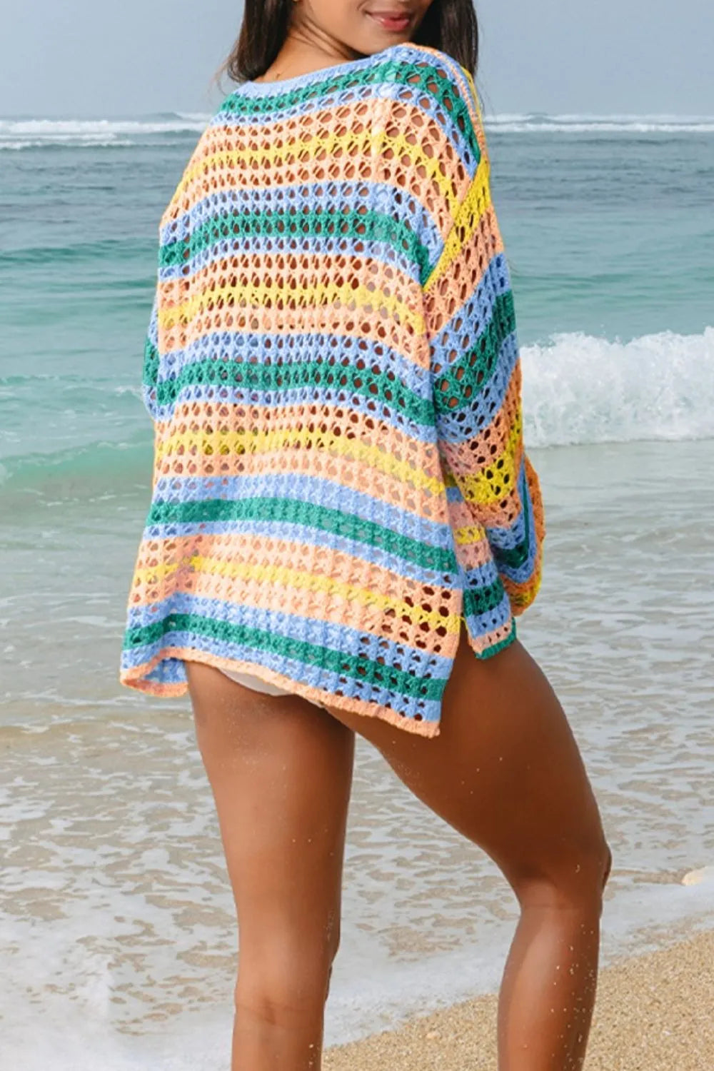 Openwork Round Neck Long Sleeve Knit Cover Up