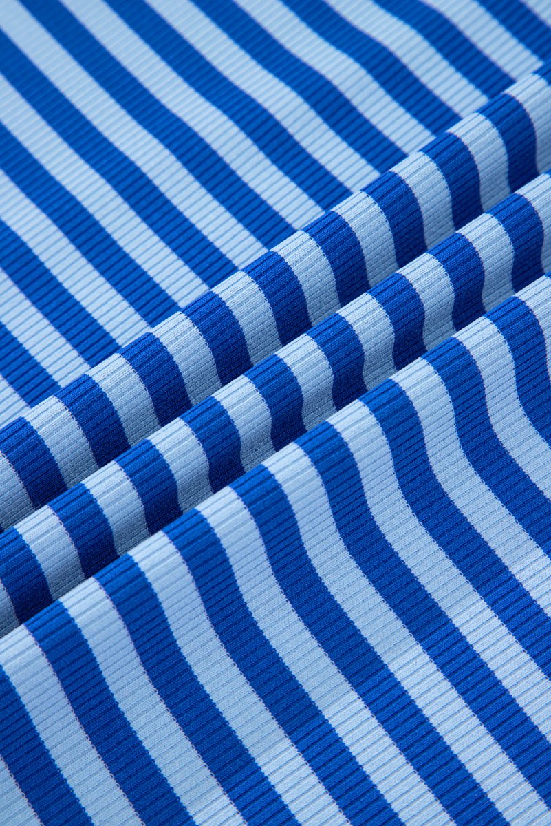 Discover effortless style with the Sky Blue Stripe Ribbed Cap Sleeve Round Neck T Shirt. Crafted from a comfortable blend of 95% polyester and 5% elastane, this tee offers a soft, breathable feel and excellent shape retention for everyday wear.