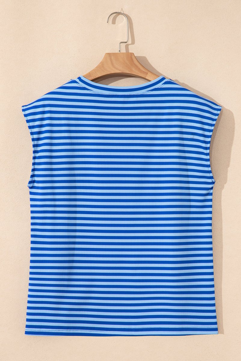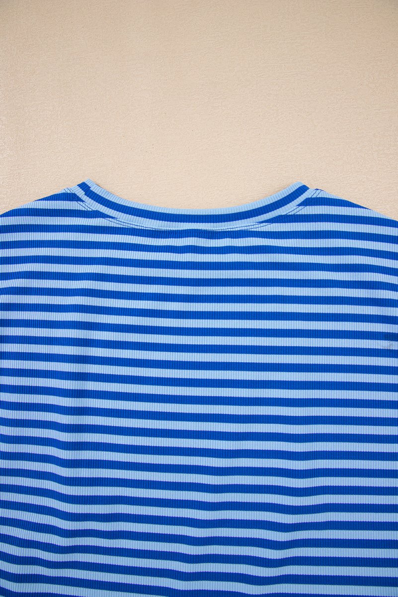 Sky Blue Stripe Ribbed Cap Sleeve Round Neck T Shirt for Women