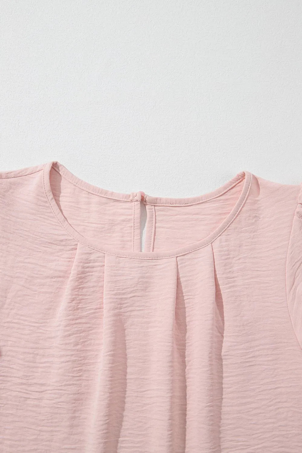 Solid Color Flounce Sleeve Pleated Round Neck Blouse