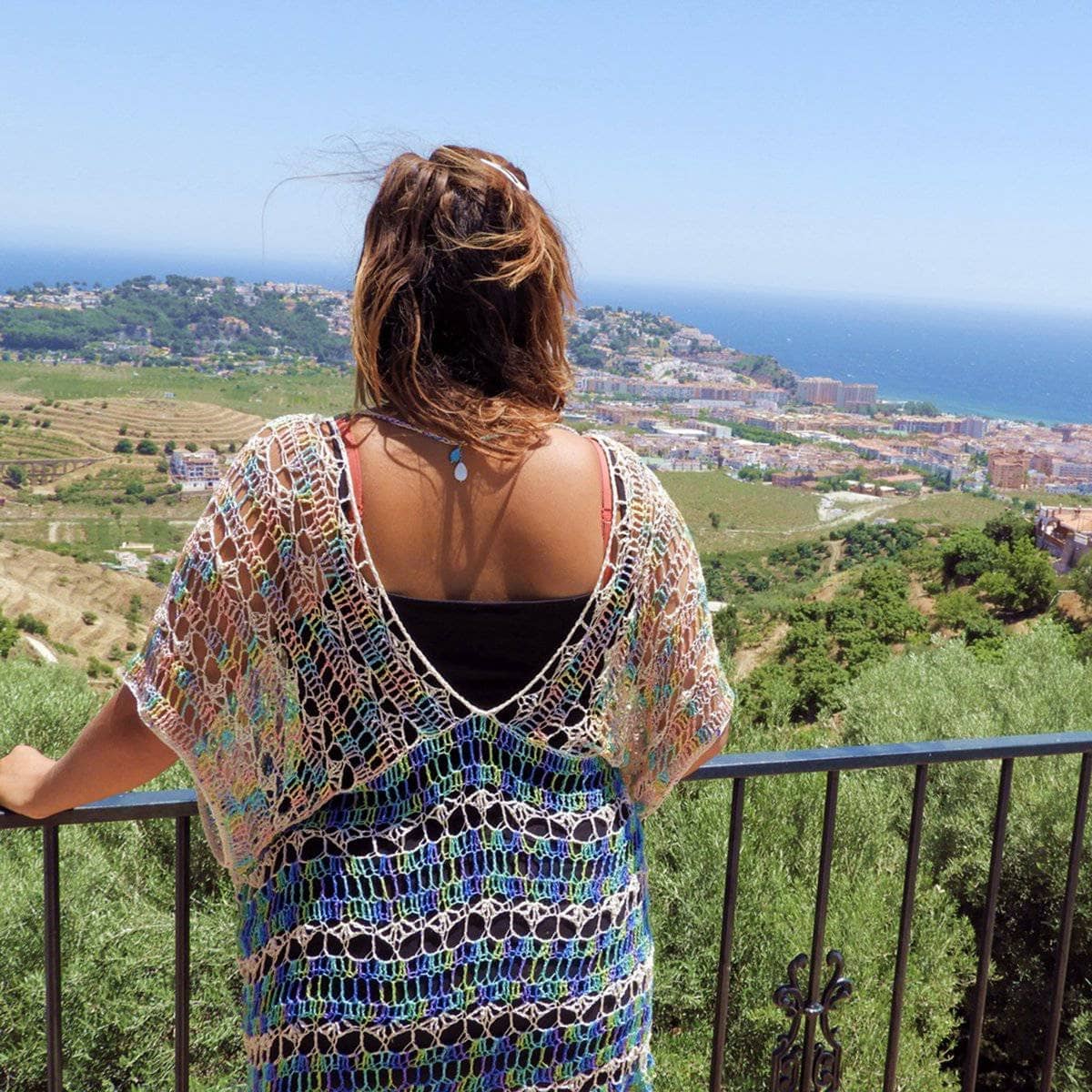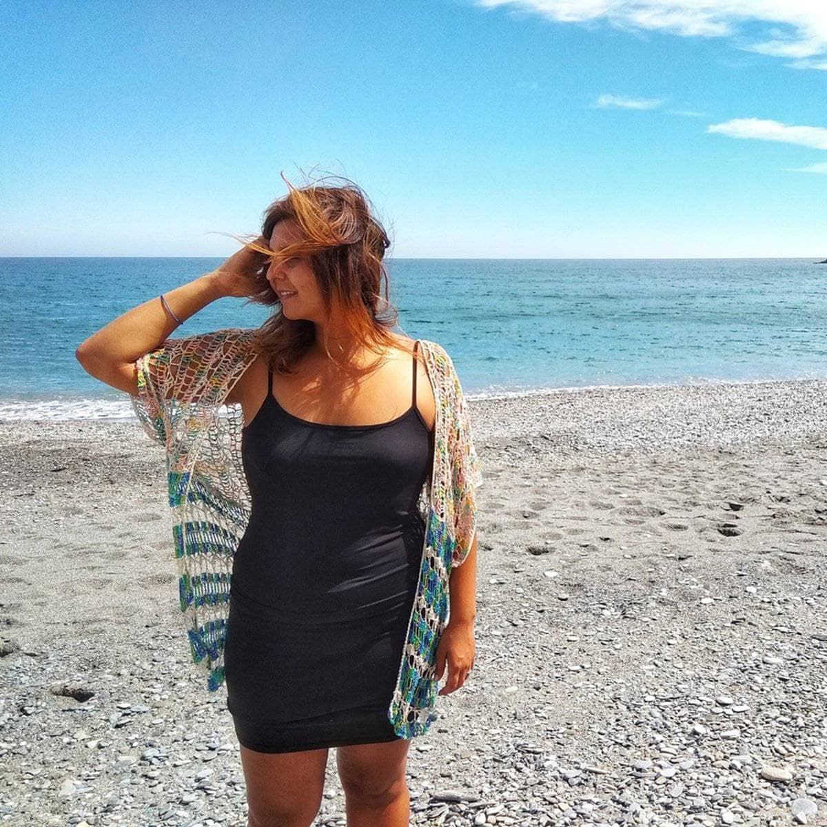 Under the Sea is an oversized duster that can be worn over anything, from a bathing suit cover-up to a luxurious accessory to a formal dress. The colors and stitches scream ocean, life, and beauty. It’s a very simple piece, with the smallest bit of sewing, all worked in one piece. Darn Good Yarns Hand Beaded Silk Yarn adds an extra sense of elegance with its drape, sheen and those dainty little beads.