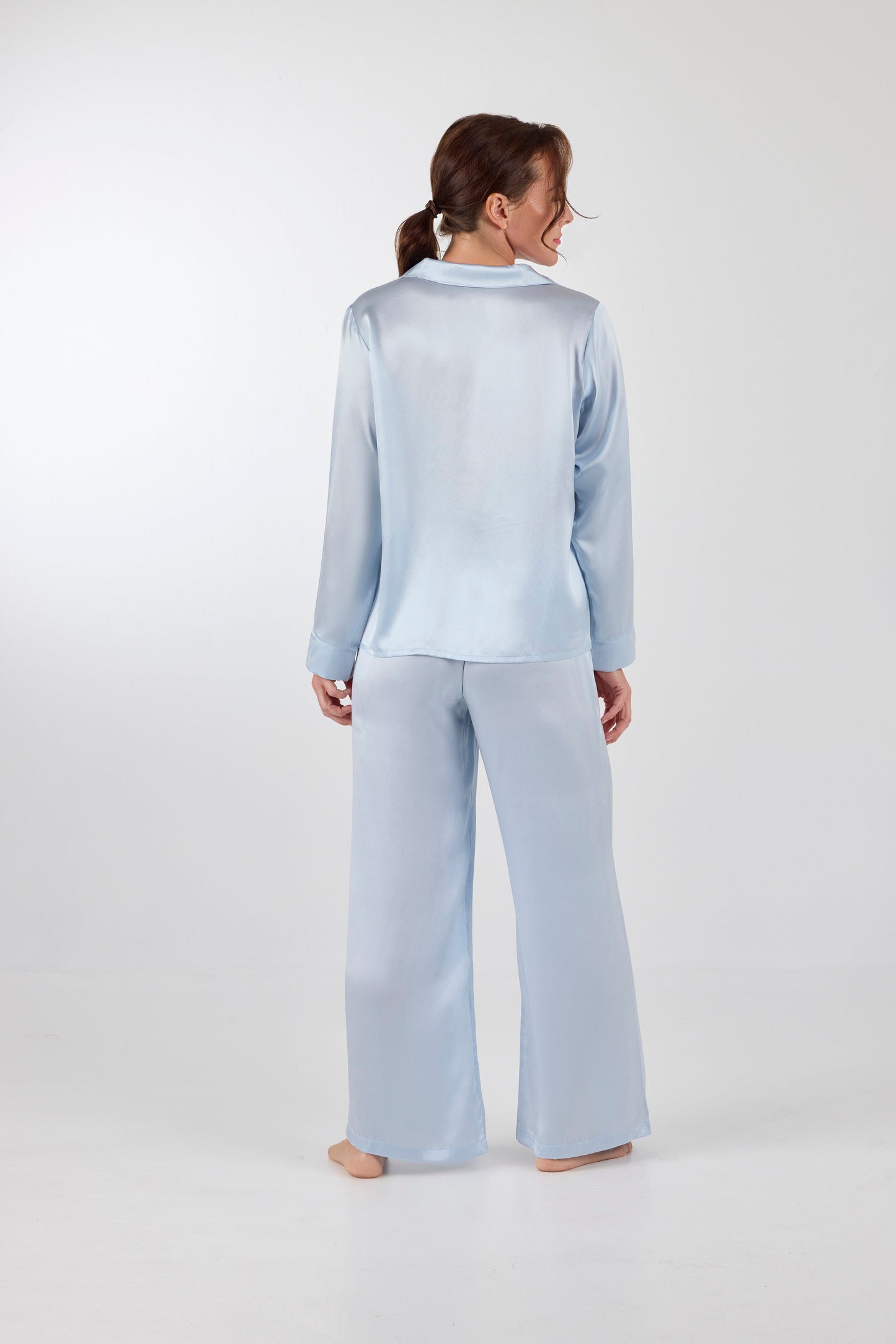 Buttery silk meets timeless design in this classic pajama set, featuring a relaxed top and wide-leg pants for a chic, relaxed feel.