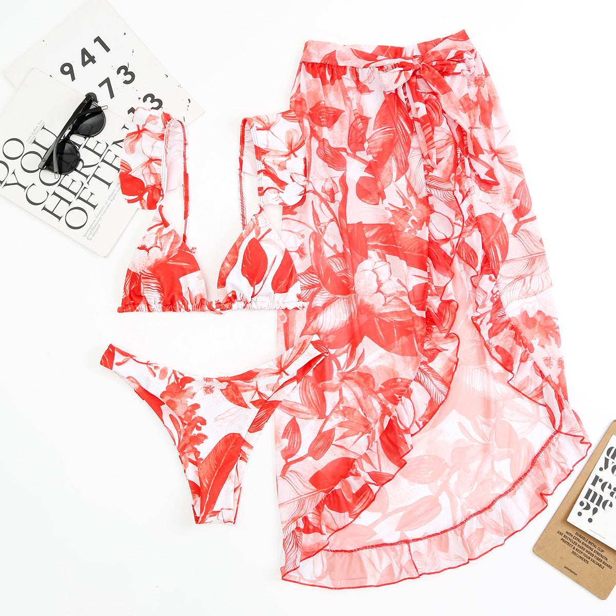Women Printed Split Sexy Double Sided Mesh Triangle Bikini Swimsuit Three Piece Set
