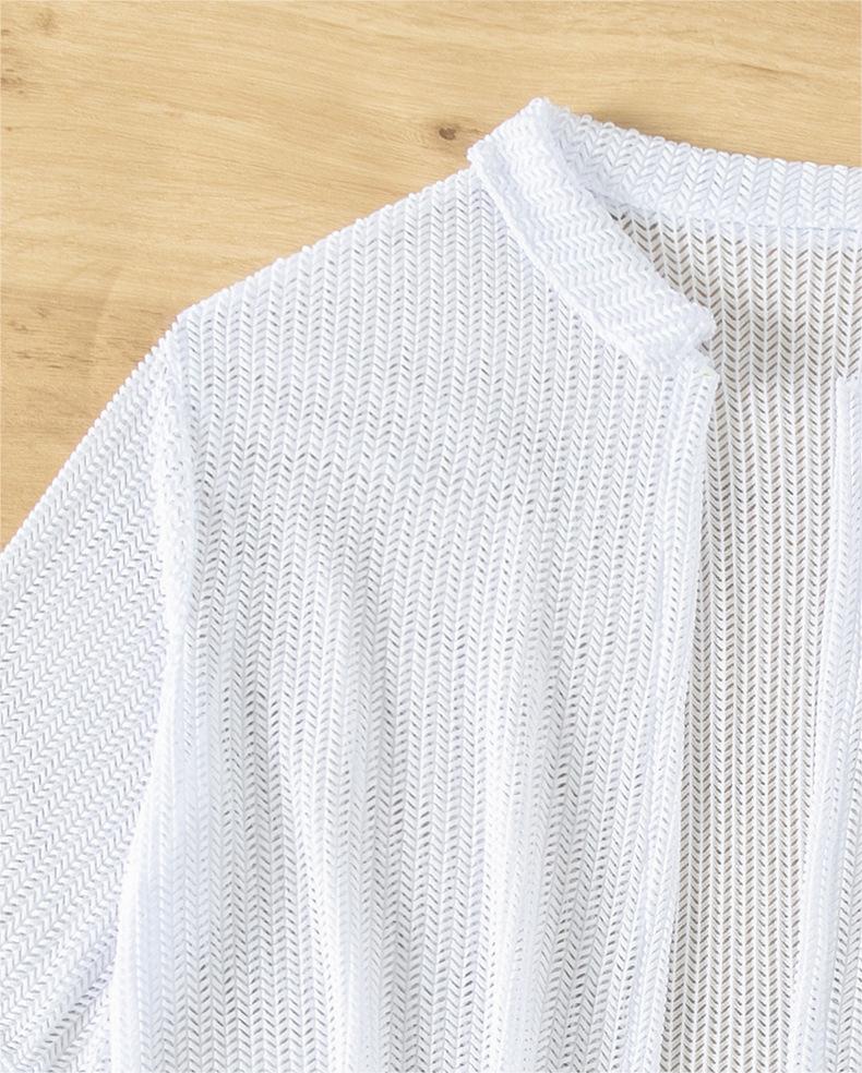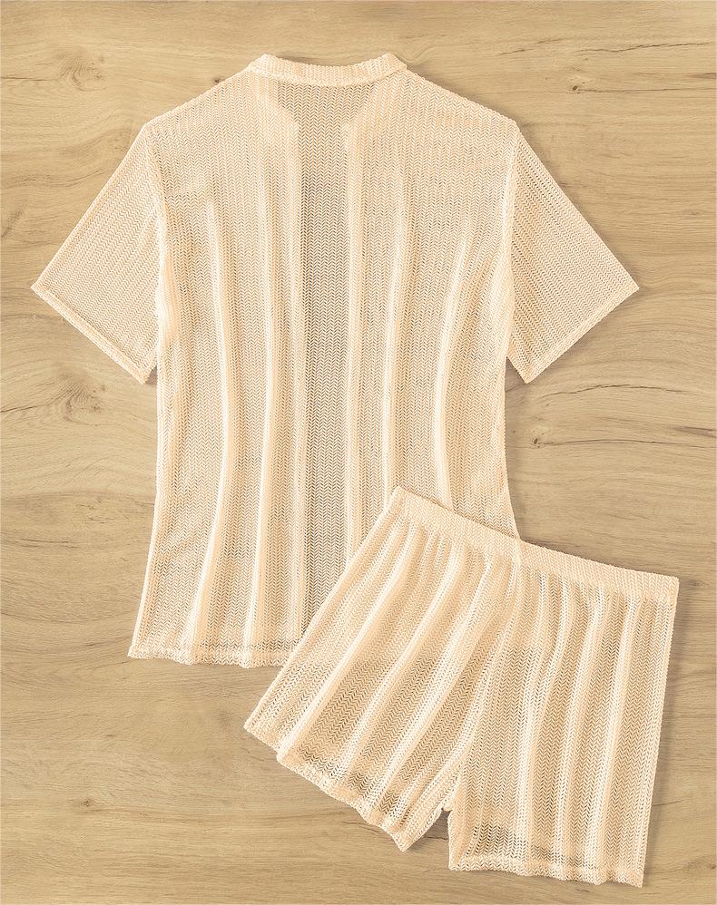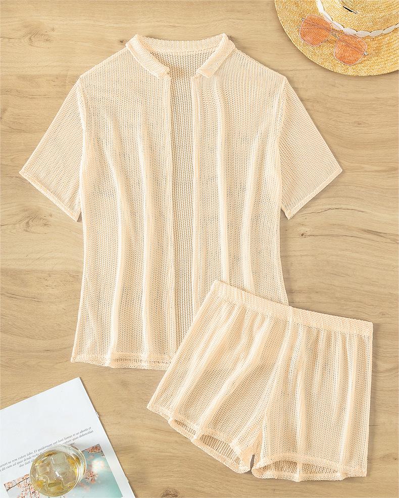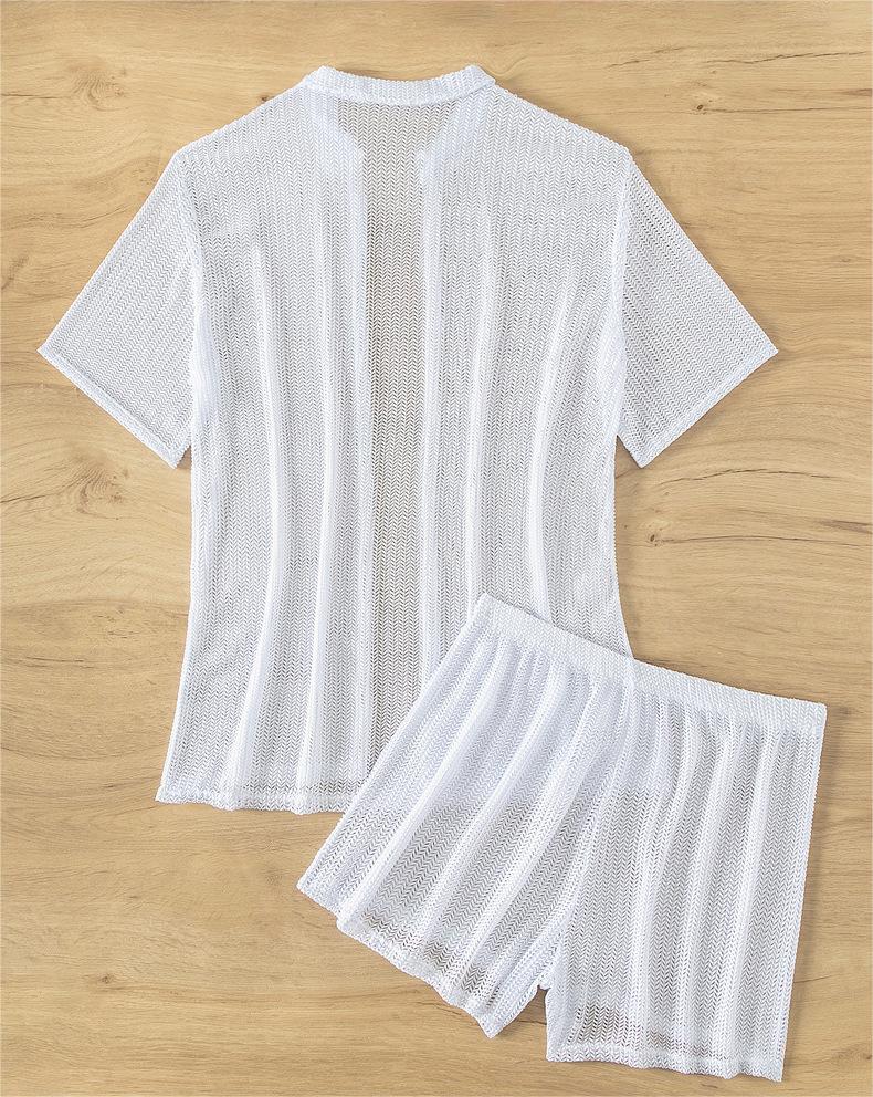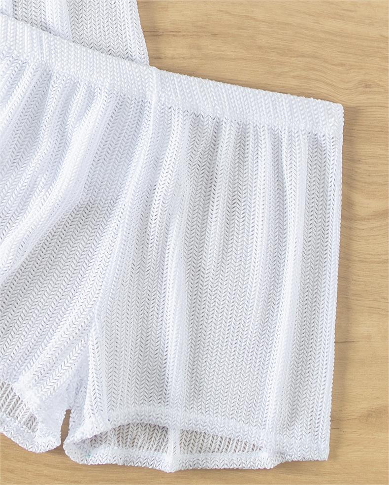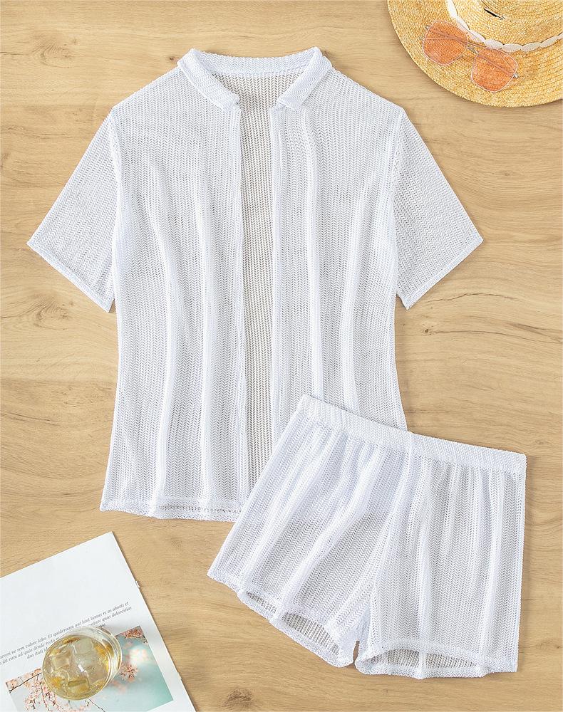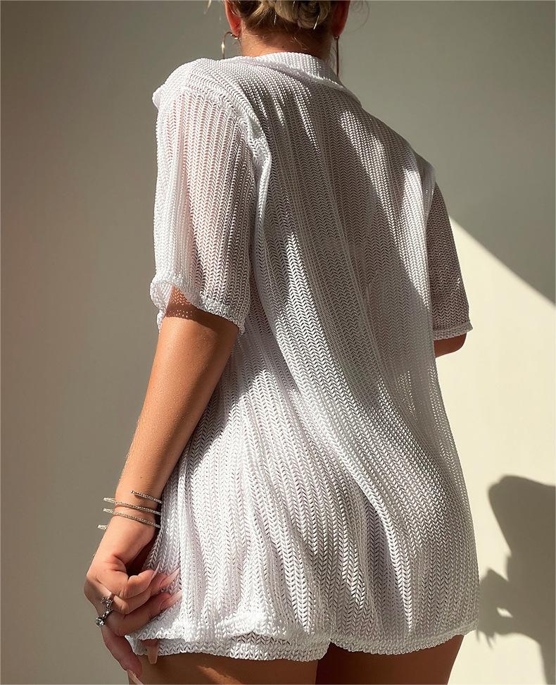 Designed for warm-weather getaways, this lightweight beachwear set features a relaxed cover-up top paired with coordinating shorts. The knit-style silhouette provides breathable coverage over swimwear while maintaining a casual, boho-inspired look. The top offers short sleeves and a longer length for comfortable layering over a bikini. The set is finished in white and crafted from nylon to support quick-drying performance suitable for summer days by the pool or on the shore.