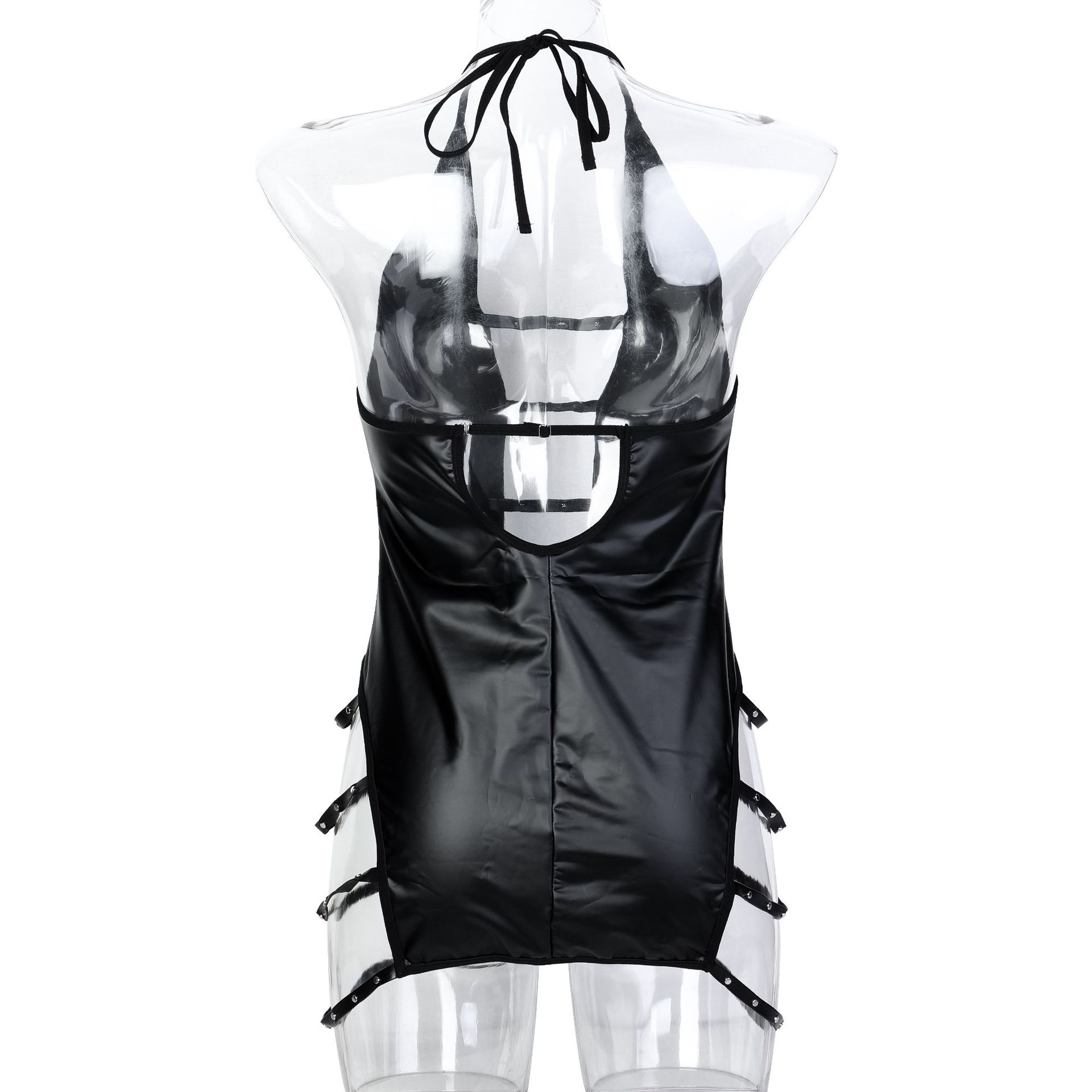 Crafted from faux leather with a polyester lining, this seasonless nightdress presents a sleek black silhouette with bold cutout details. The halter neckline ties at the back, framing a deep V plunge and a series of horizontal strap panels that form hollow-out openings. Metal studs along the straps add subtle shine, while side cutouts enhance the silhouette without sacrificing comfort. The form-fitting design is tailored for intimate wear at home, offering a daring yet sophisticated look that pairs with confidence.