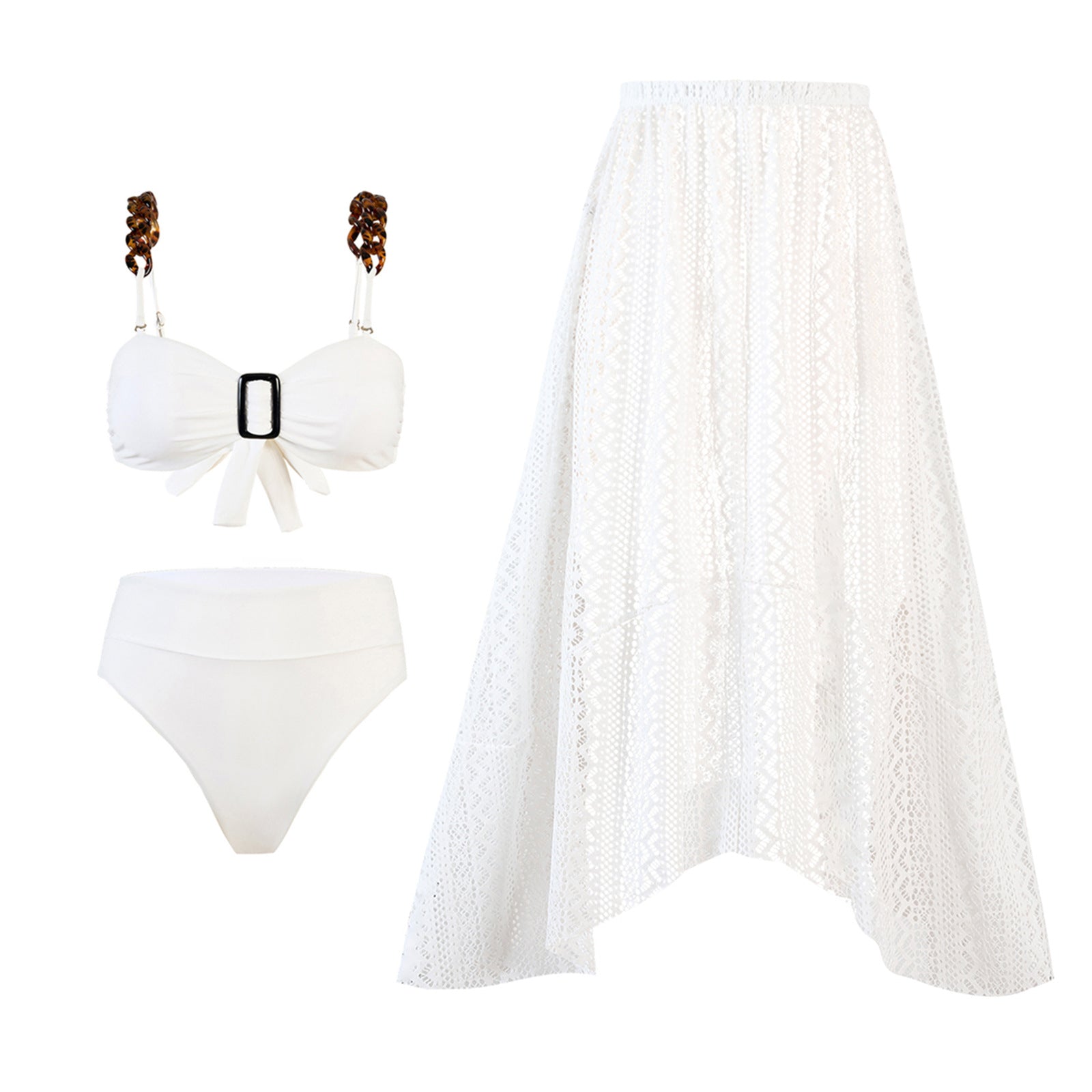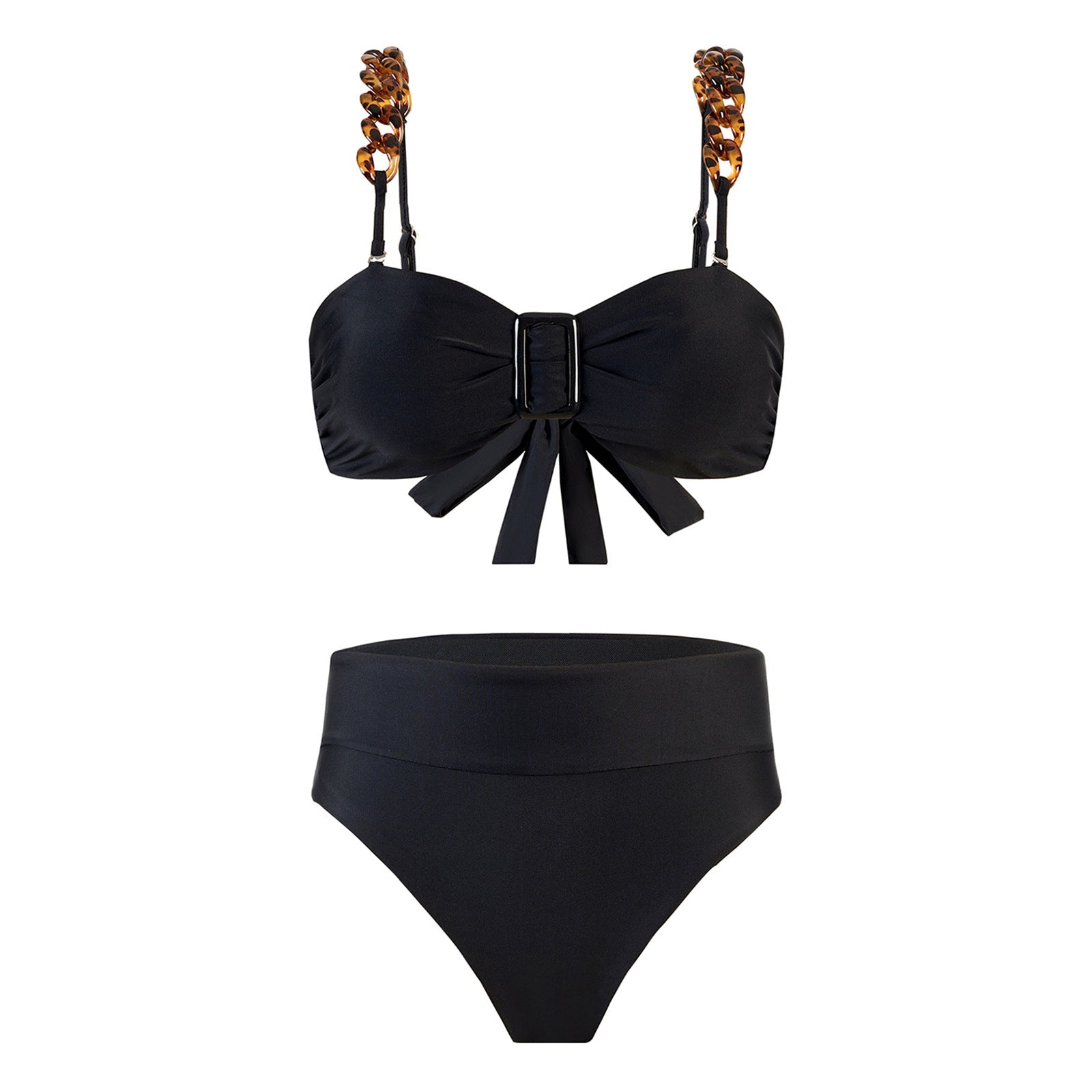 This high waist bikini set blends boho-inspired style with practical swimwear design. Constructed from lightweight nylon, the pieces dry quickly and resist wear in summer conditions. The top presents a bandeau silhouette with a centered bow and decorative ring, complemented by slender straps with a tortoise-shell effect for a secure, flattering fit. The matching high‑waist bottom provides fuller coverage while shaping the silhouette for comfortable movement in and out of the water.