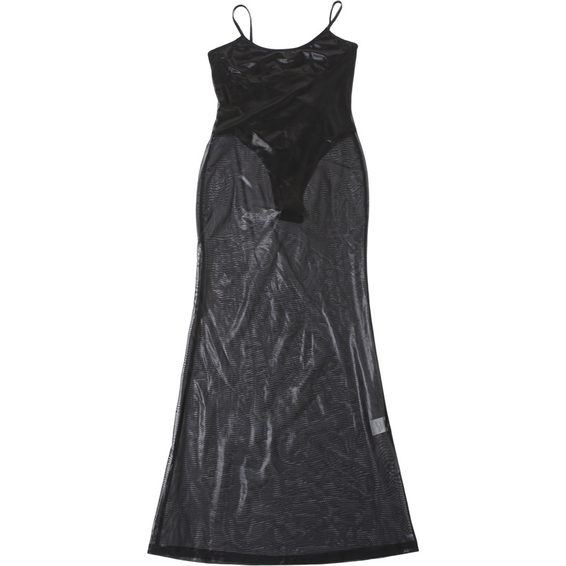 Designed for warm-weather events, this sheath dress offers a sleek, figure-flattering silhouette. The piece features a slip-on, sleeveless design with spaghetti straps and a semi-sheer overlay that accentuates the high waist and curves. Made from polyester, the solid fabric provides structure while the lace, tulle, and fishnet elements add texture and visual interest. The patchwork detail enhances the contemporary appeal of a maxi-length dress suitable for party and club settings.