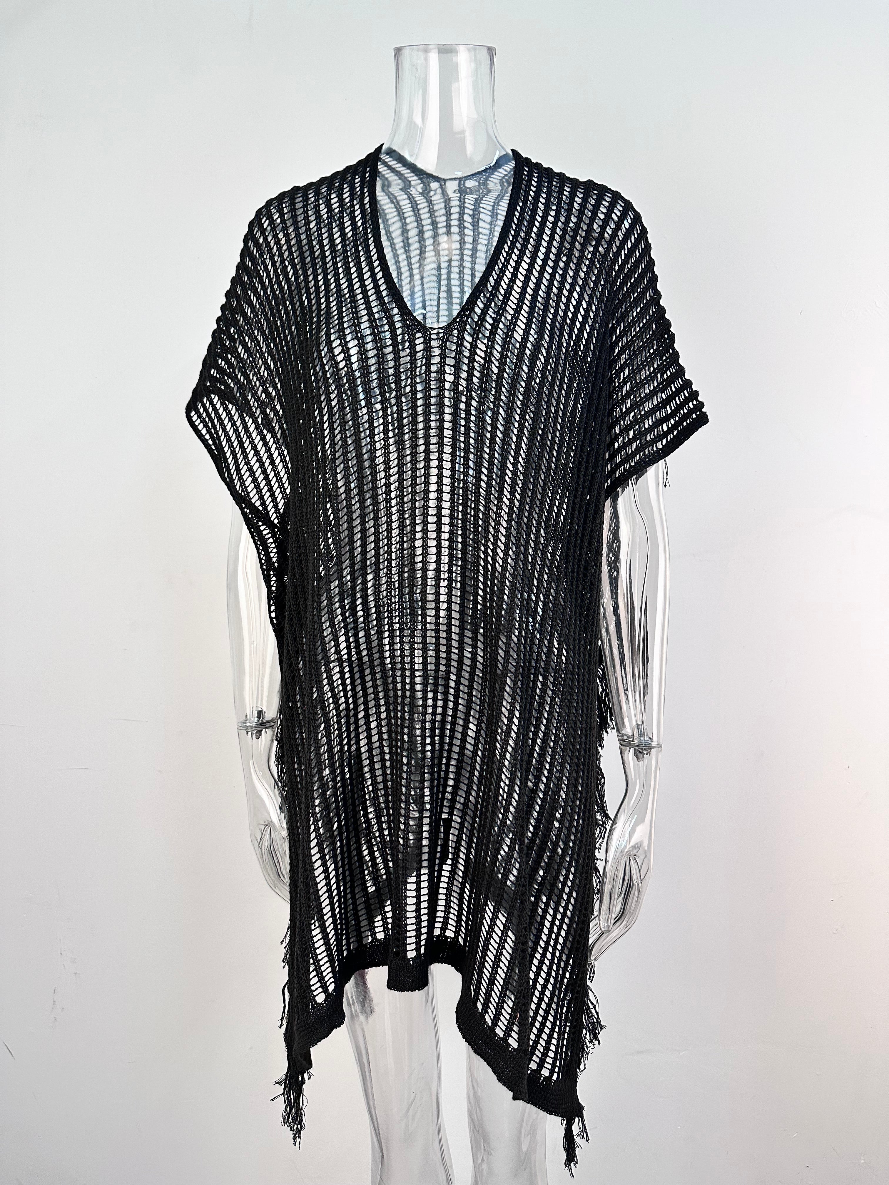 This Summer Mid Length V-Neck Hollow Out Cutout Tassel Beachwear offers relaxed, vacation-ready style for seaside days. Crafted from lightweight jersey with a polyester base, it drapes loosely over swimwear while delivering breathable comfort. A V-neckline and short sleeves frame the upper body, while the open-knit design creates a modern, airy look. The hem is finished with fringe tassels for a carefree, boho-inspired touch.