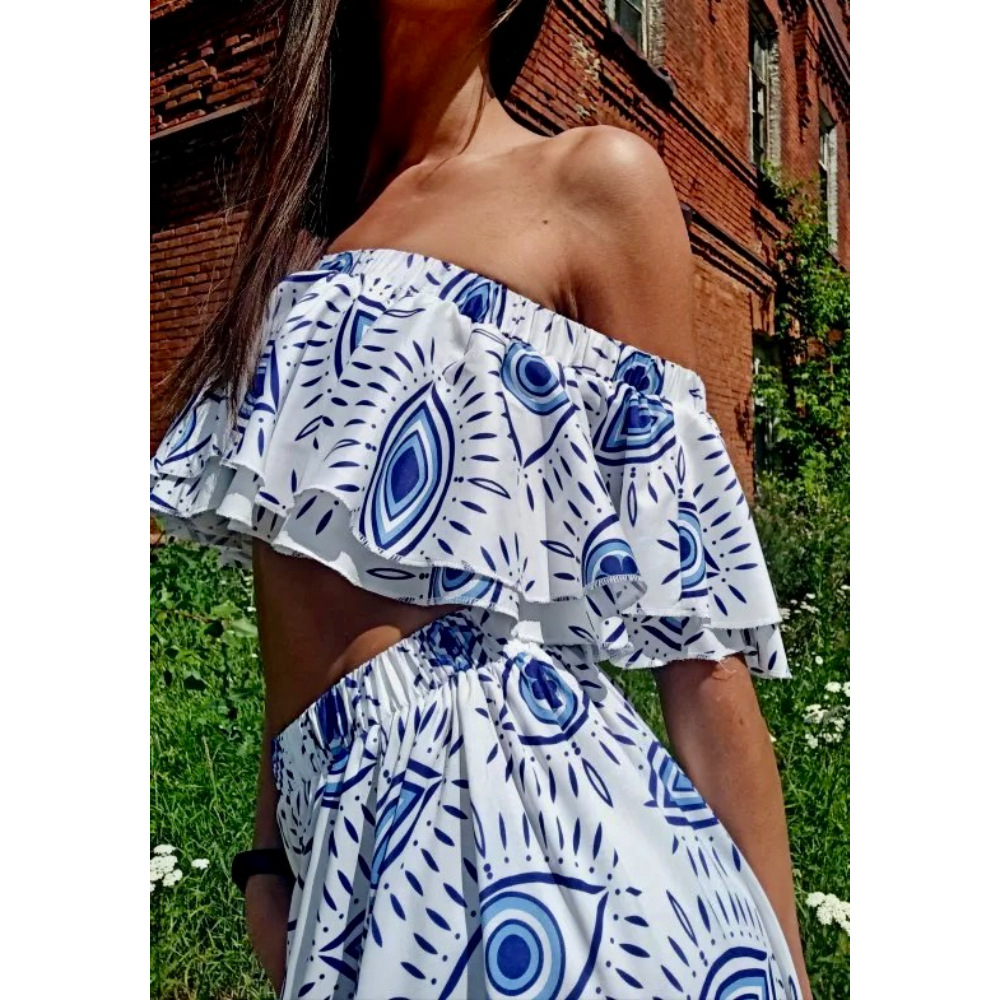 Embrace a carefree boho look for summer with this polyester swim set designed for vacation. The off-shoulder top is finished with a layered ruffle that drapes across the bust, while the high-waisted bottom provides comfortable coverage. The pale blue and white graphic print creates a coastal-inspired motif that coordinates easily with sun and sand. Made from durable, quick-drying polyester, this swimsuit is suitable for beach days, poolside lounging, and resort vacations.