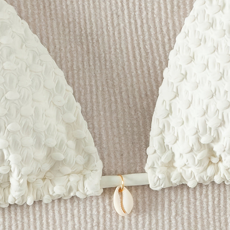 This solid-color bikini combines a boho-inspired aesthetic with practical design for summer beachwear. The fabric is polyester, offering durability and quick-drying comfort suitable for poolside use. The triangle top uses a halter strap with a small center accent, while the bottom features adjustable lace-up side ties for a personalized fit and secure silhouette.