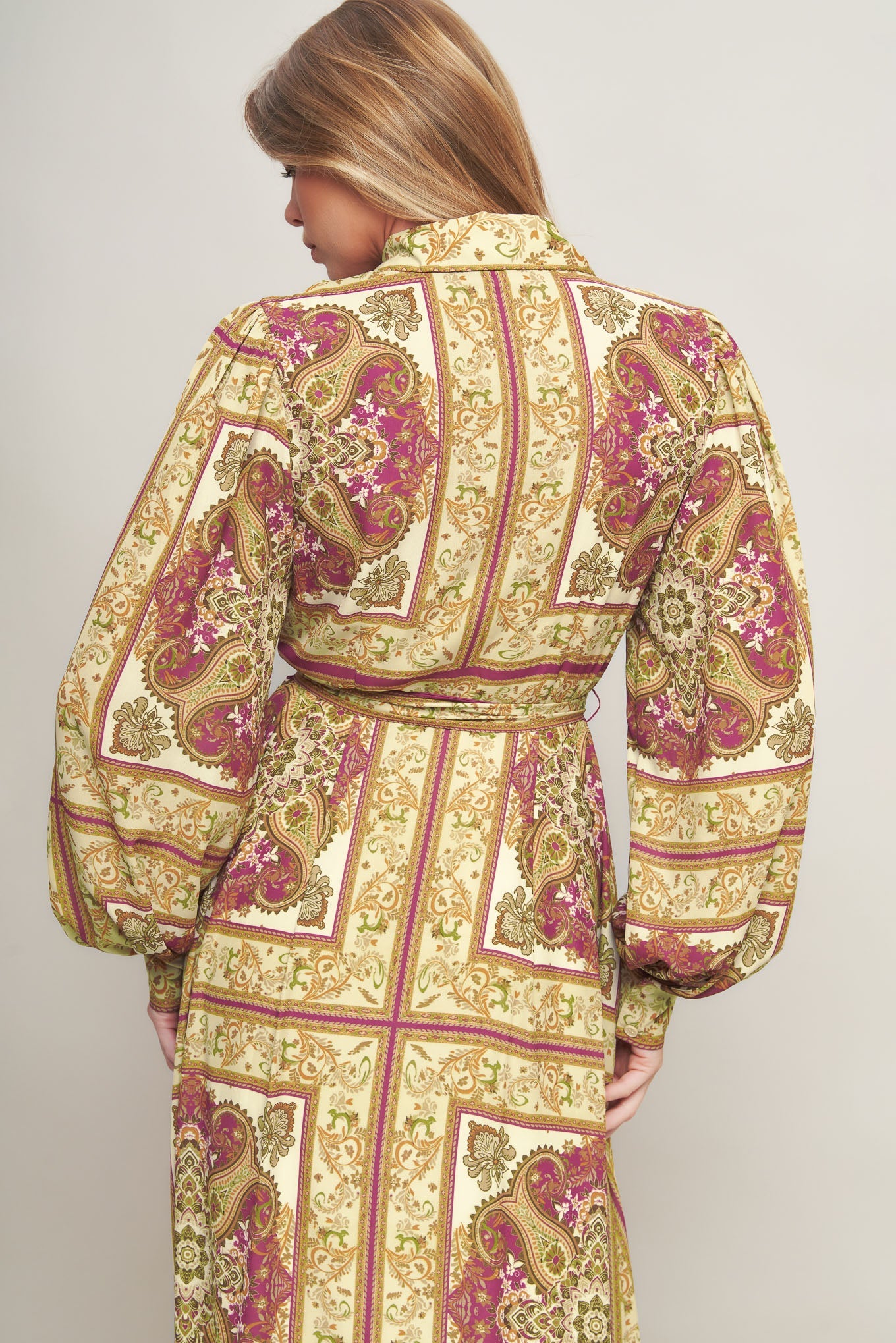 A printed woven maxi dress featuring collar, long sleeve with cuff, front button down, self sash tie and ruffled hemline