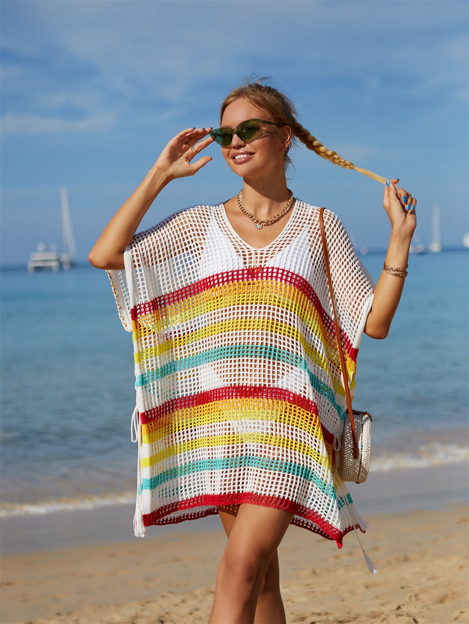 Summer Beach Cover Up Knitted Rainbow Color Holiday Blouse Bikini Sweater